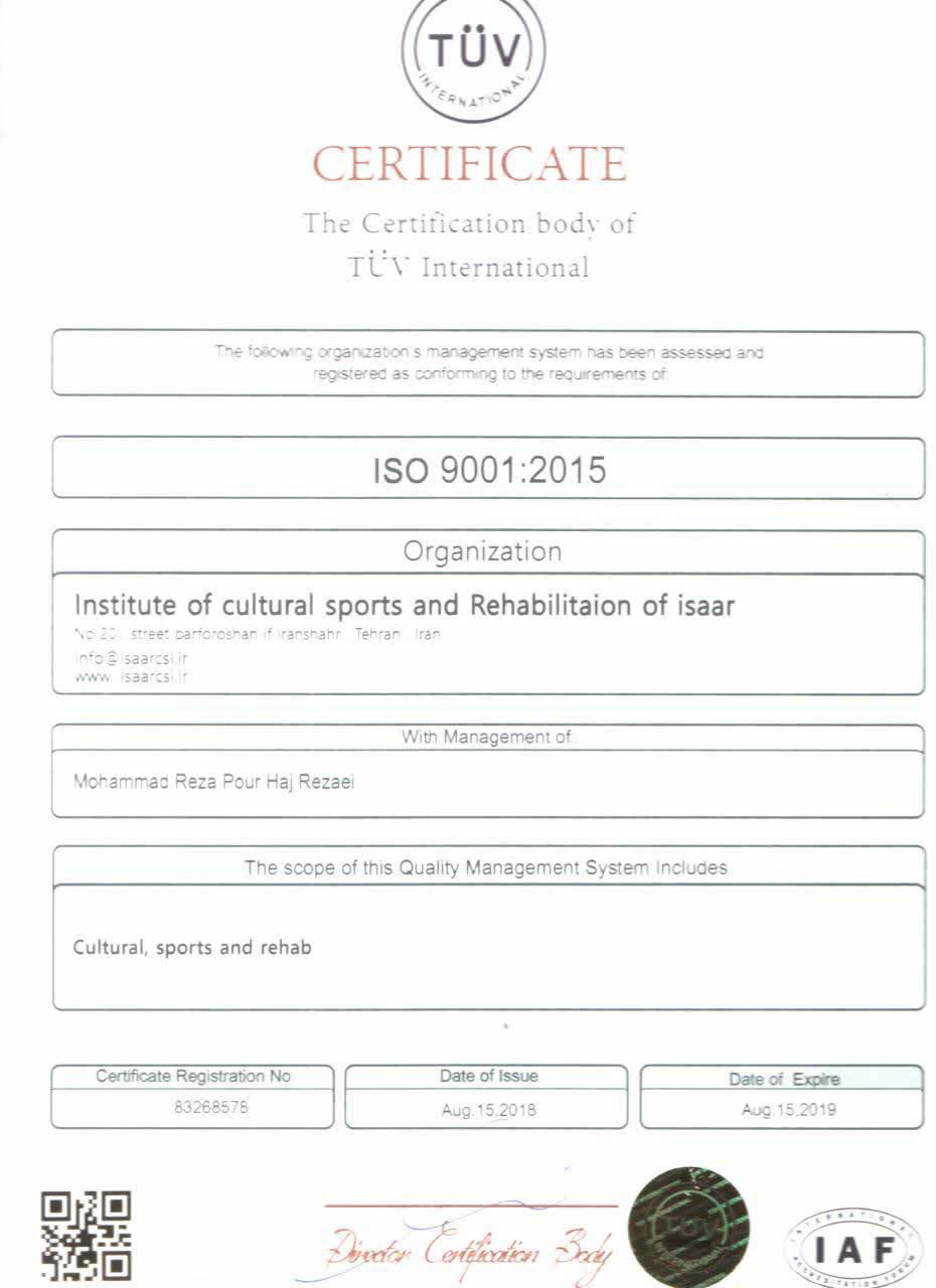 موسسه ایثاردر سایه الطاف الهی و همفکری و همکاری هیات مدیره موسسه وتلاش شبانه روزی همکاران درسراسر کشور با رعایت استانداردهای مدیریتی تولید و عرضه محصولات و ارائه خدماتِ با کیفیت به جامعه معظم ایثارگری،در عرصه تجارت داخلی و جهانی که داشتن گواهی نامه تأیید صلاحیت استانداردهای سریِ ایزو شرط اولیه در داد و ستد داخلی و بین المللی می باشد، در این راستا،طبق بررسی و ممیزی انجام شده، این موسسه موفق به اخذگواهینامهISO 9001):(2015 سیستم مدیریت کیفیت جهت فعالیت های خود در سه حوزه فرهنگی، ورزشی و توانبخشی از شرکت (internatuonail TUV) نائل گردید،که با اخذ این گواهینامه برگ زرین دیگری برای موسسه ایثار رقم خورد.